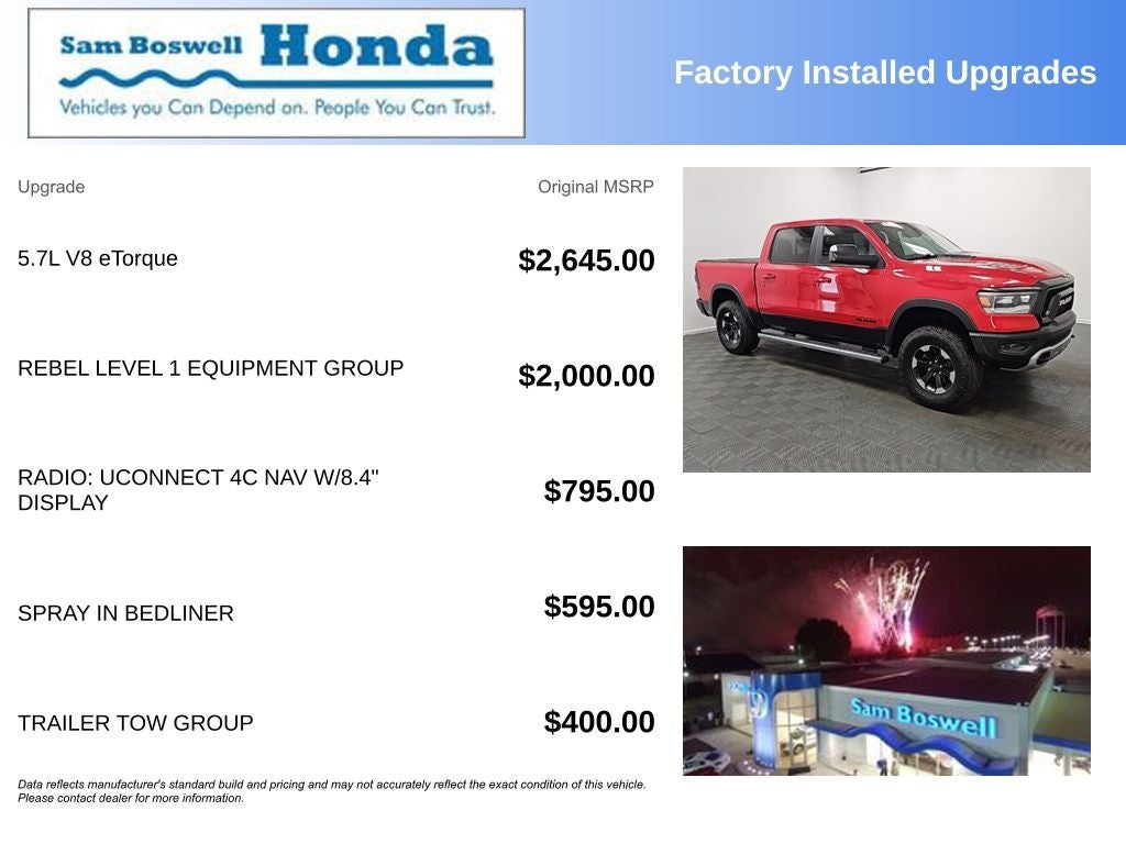 *Detailed*, Alloy Wheels, * Heated Seats, * Backup Camera, * Navigation System, * Bluetooth®, * Apple CarPlay / Android Auto, 8.4 Touchscreen Display, Apple CarPlay, Auto-Dimming Exterior Driver Mirror, Auto-Dimming Rear-View Mirror, Body Color Door Handles, Exterior Mirrors Courtesy Lamps, Exterior Mirrors w/Supplemental Signals, Foam Bottle Insert (Door Trim Panel), Google Android Auto, Heated Front Seats, Heated Steering Wheel, Integrated Center Stack Radio, Power Adjustable Pedals, Power Black Trailer Tow Mirrors, Power Heated Fold Away Mirrors, Power-Folding Mirrors, Quick Order Package 27W Rebel, Radio: Uconnect 4 w/8.4 Display, Rear Dome w/On/Off Switch Lamp, Rear Window Defroster, Rebel Level 1 Equipment Group, Single Disc Remote CD Player, Sun Visors w/Illuminated Vanity Mirrors, Trailer Brake Control, Trailer Tow Group, Trailer Tow Mirrors, Universal Garage Door Opener.